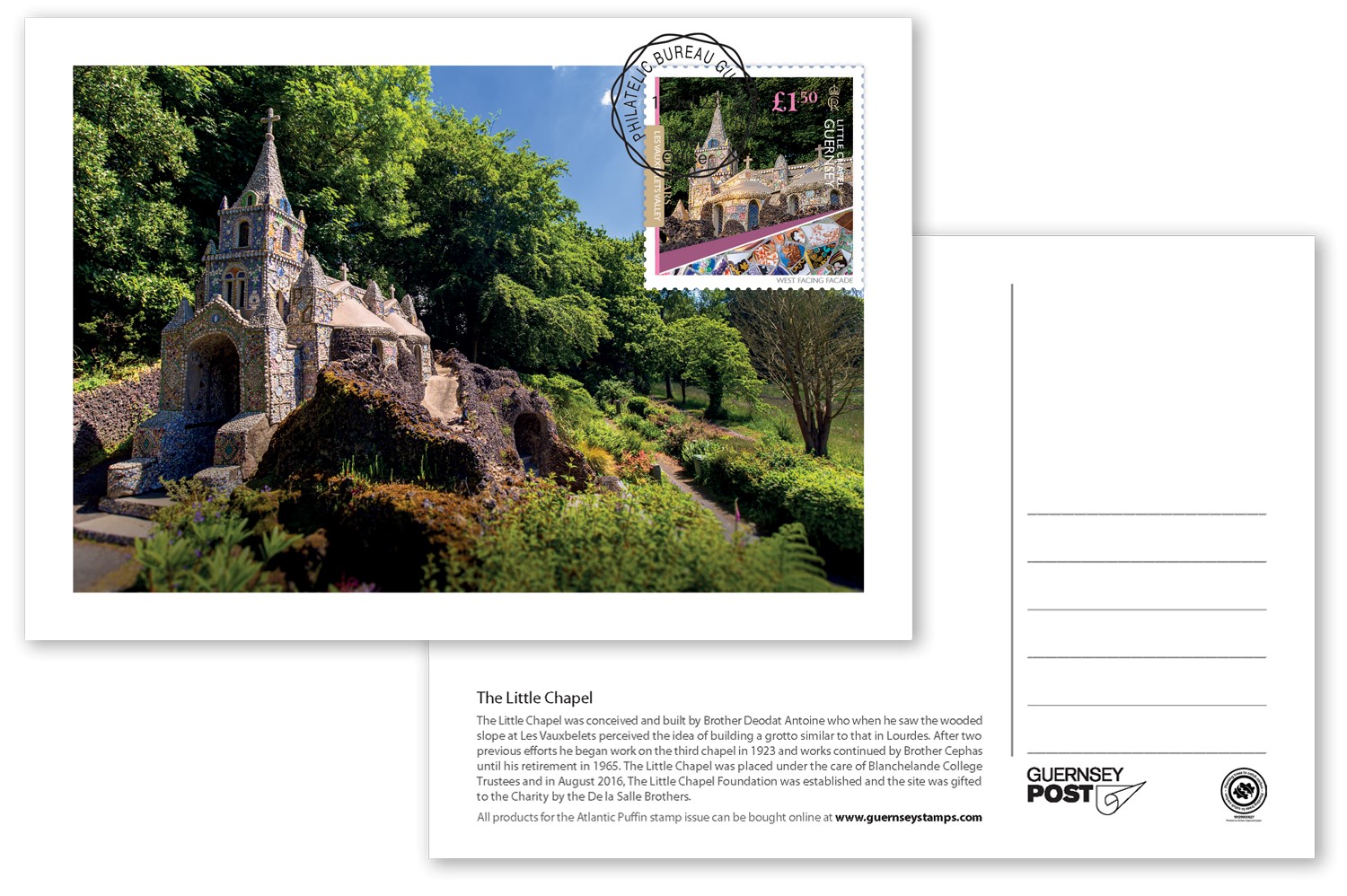 A postcard featuring The Little Chapel with the associated stamp cancelled on the front of the card.