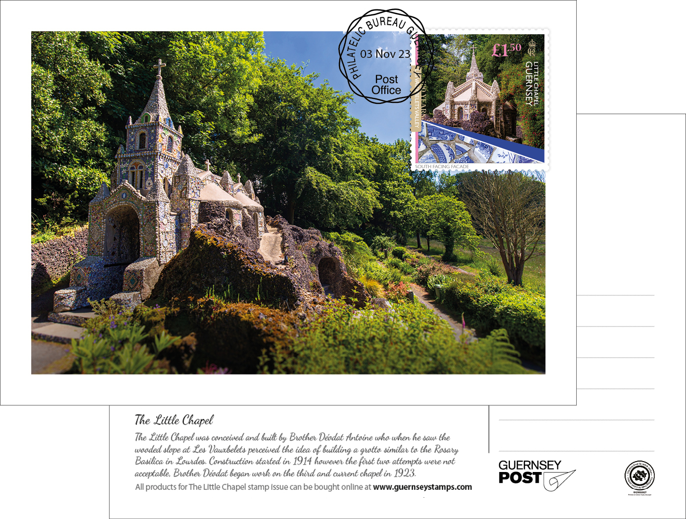 A postcard featuring The Little Chapel with the associated stamp cancelled on the front of the card.