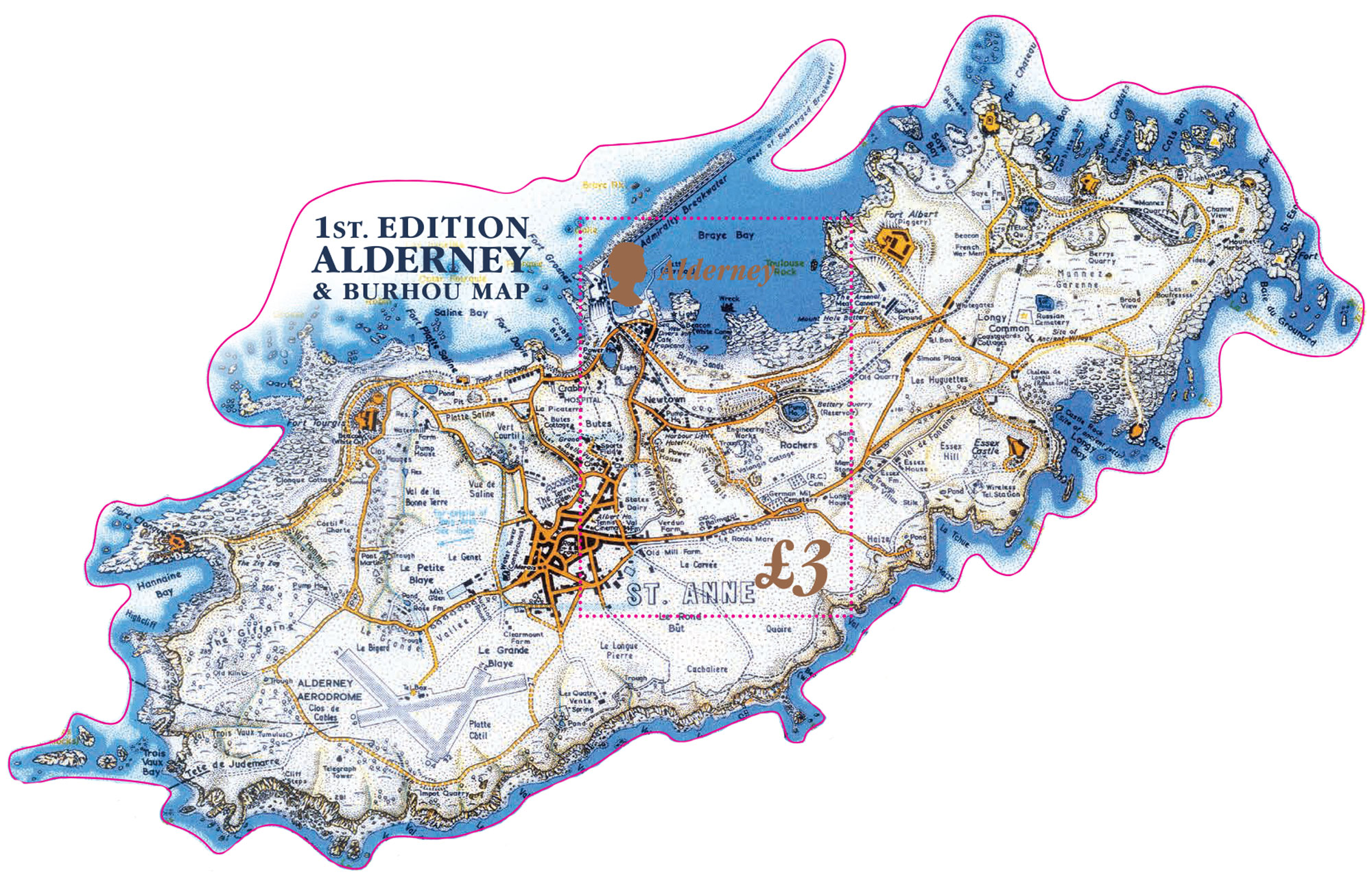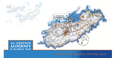 The miniature sheet die-cut with the shape of Alderney containing one stamp.