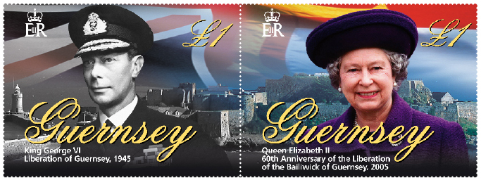 This definitive se-tenant pair featuring King George VI and HM The Queen Elizabeth II commemorates the Liberation of the Bailiwick of Guernsey from enemy occupation on 9 May 1945. Ever since the people of Guernsey swore their allegiance to the English Crown in 1204, the Bailiwick has enjoyed a strong and lasting relationship with the Monarchy. Royal visits have always been eagerly anticipated and one that was received with joy and enthusiasm was that of King Geoorge VI and Queen Elizabeth on 7 June 1945.