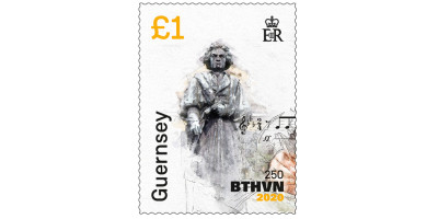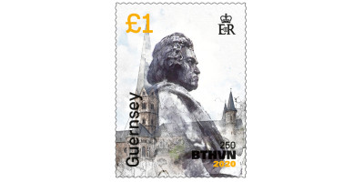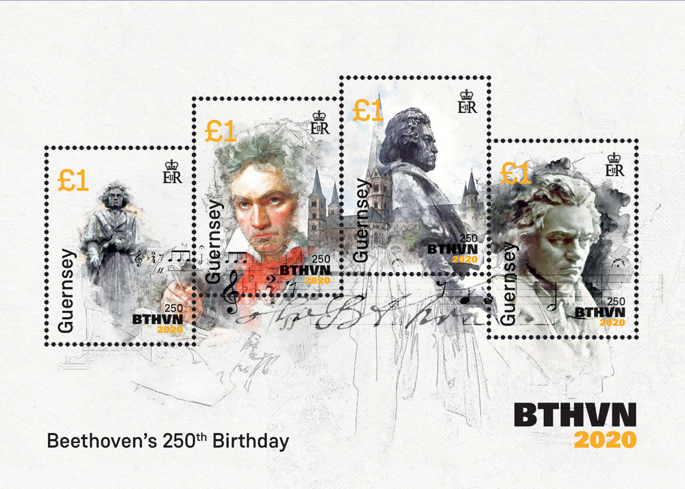 A small sheet containing one of each stamp from the issue, set against an illustrated background.