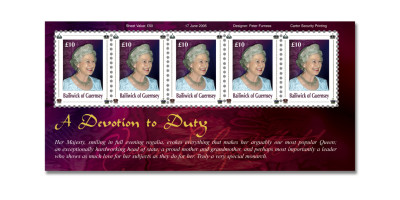 The occasion of the 80th birthday of Her Majesty The Queen is honoured by a single £10 definitive featuring a variety of print techniques to include embossing, foil and microprint.
