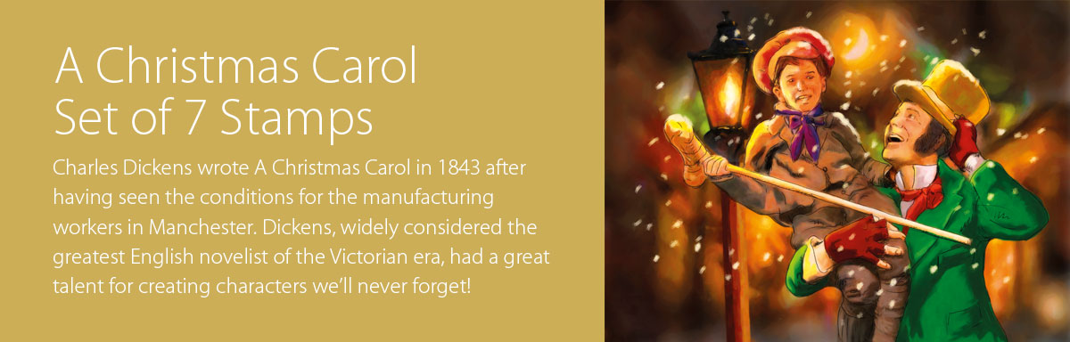 Charles Dickens’ famous Christmas story ‘A Christmas Carol’ is vividly depicted in Alderney’s festive set of stamps, designed by illustrator Andrew Robinson.