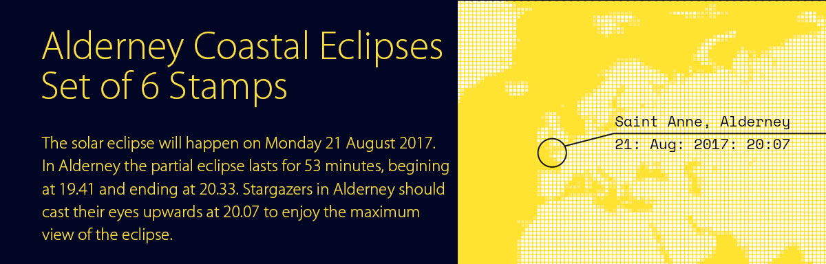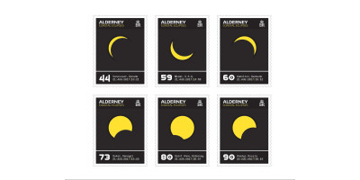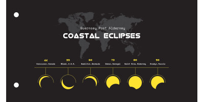 To mark the next total solar eclipse on 21 August 2017, when all of North America will be fortunate enough to witness an eclipse of the Sun, we've depicted six coastal locations that will be treated to a partial eclipse, including Alderney. These specially produced heat sensitive stamps reveal information and full eclipses upon coming into contact with warm hands.