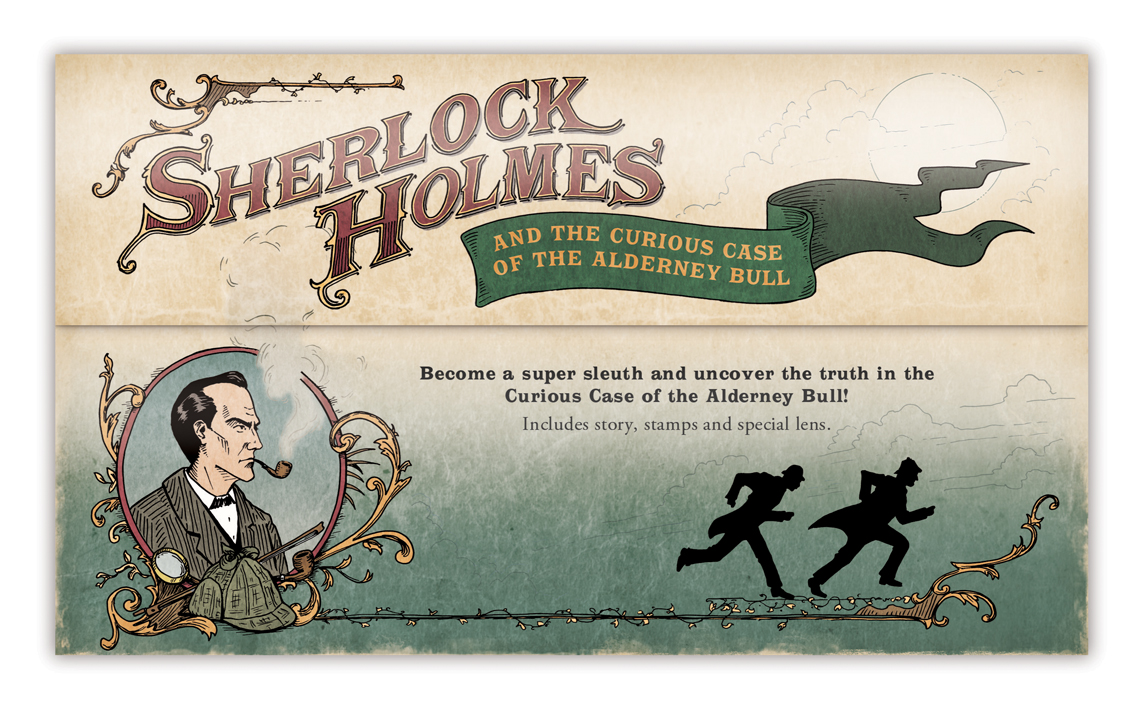 Beautifully illustrated, the set of six stamps are presented in a "Mystery Pack" - a philatelic first - which tells the story of Sherlock Holmes and the Curious Case of the Alderney Bull.