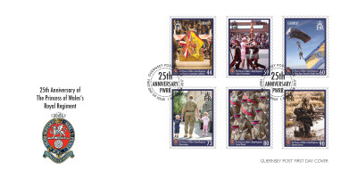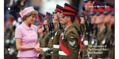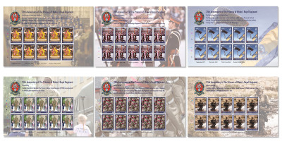 We are delighted to depict the Regiment across our stamps, which comprise members of the Flying Tigers Freefall Parachute Display Team; the annual carol service at Canterbury Cathedral where Regimental Colours are displayed; 3PWRR at a Freedom Parade; a 1WPRR soldier returning from a tour of duty; a soldier from 2PWRR training in the Falkland Islands; Diana, Princess of Wales, the Regiment's former Colonel in Chief, presenting new Colours to the Ensign on the formation of the Regiment.