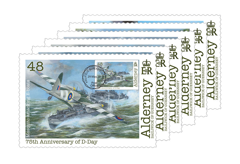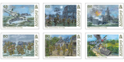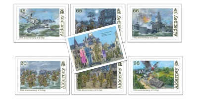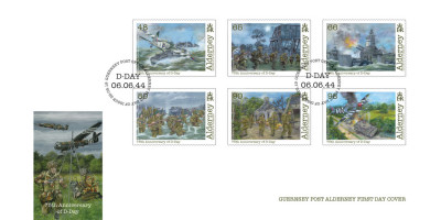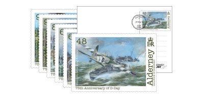 A set of six postcards featuring the D-Day issue with the associated stamp cancelled on the front of the card.
