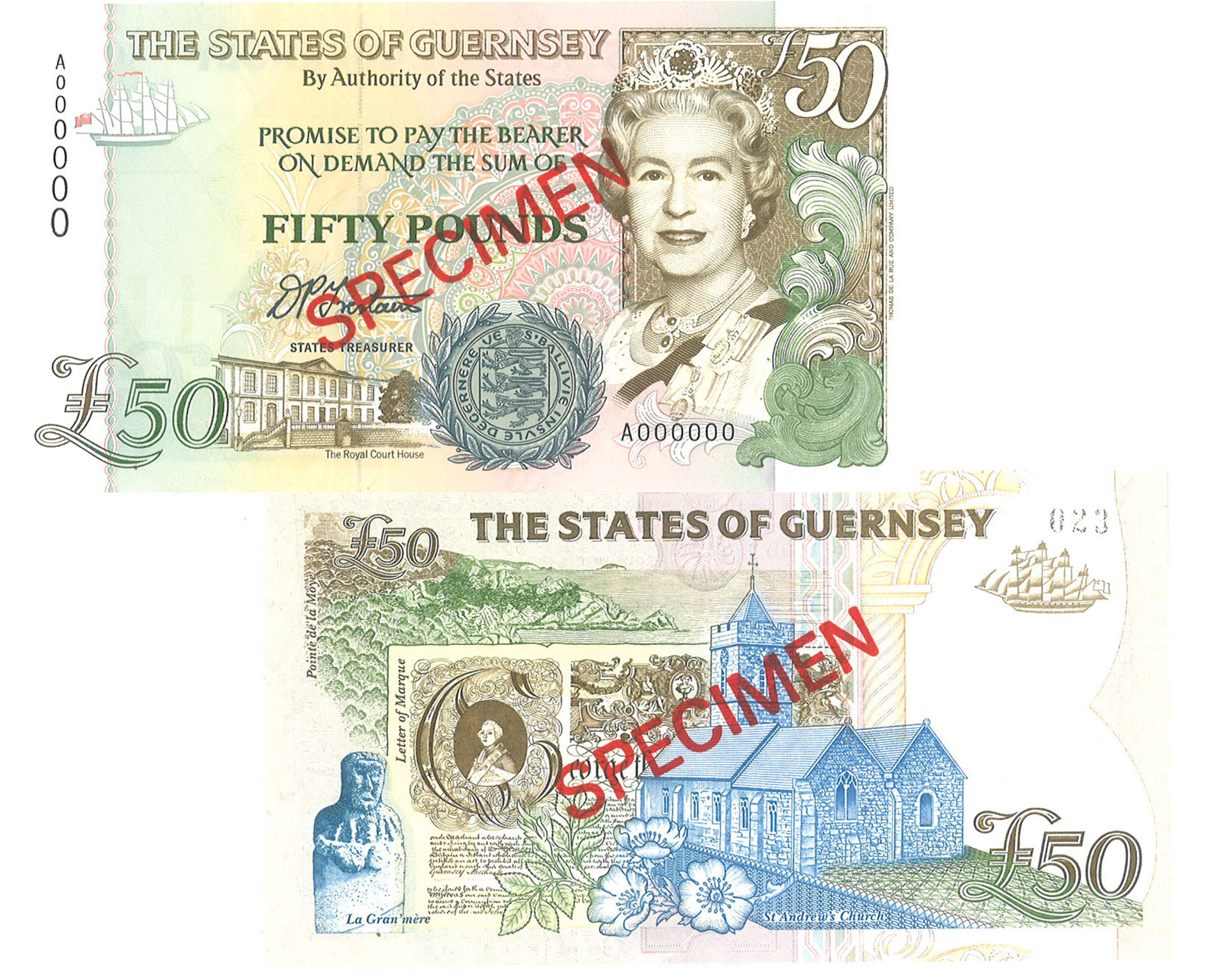 As well as Her Majesty The Queen, this note includes illustrations of The Royal Court House,, St Andrew's Church, Poine de la Moye, La Gran mere and a Letter of Marque. They have been designed and printed by De La Rue Currency, a company started by Guernseyman Thomas De La Rue in the 19th Century.