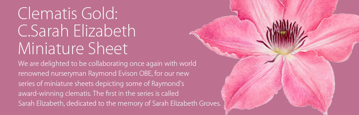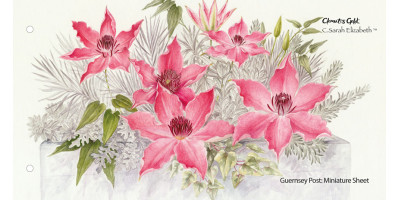 We are excited to release the first miniature sheet in our new series Clematis Gold, which depicts clematis cultivated by world-renowned nurseryman and Guernsey grower, Raymond Evison OBE. Each of the clematis in the series has been part of the Gold Medal winning displays at the RHS Chelsea Flower Show, the world’s most prestigious horticultural event.