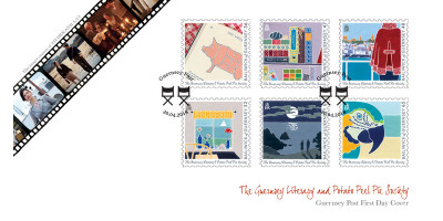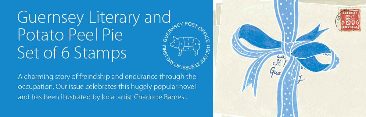 The first stamp (36p) refers to how the Literary Society began, when Dawsey Adams dispatches the pig that Amelia Maugery has hidden from the Germans and feasts on it with Amelia and her friends.