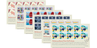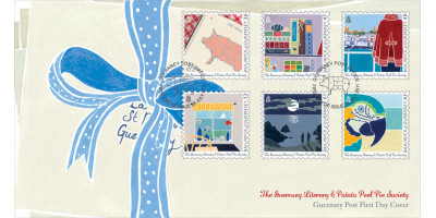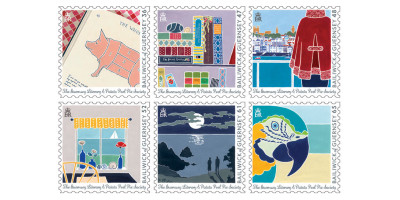 The scene of stamp number four (52p) is the view through Elizabeth McKenna's window. During Juliet's stay, she discovers that Elizabeth, the absent heart of the group, was a collector of things, which she displayed throughout her cottage. The poppy is a tribute to the lives lost in the War.