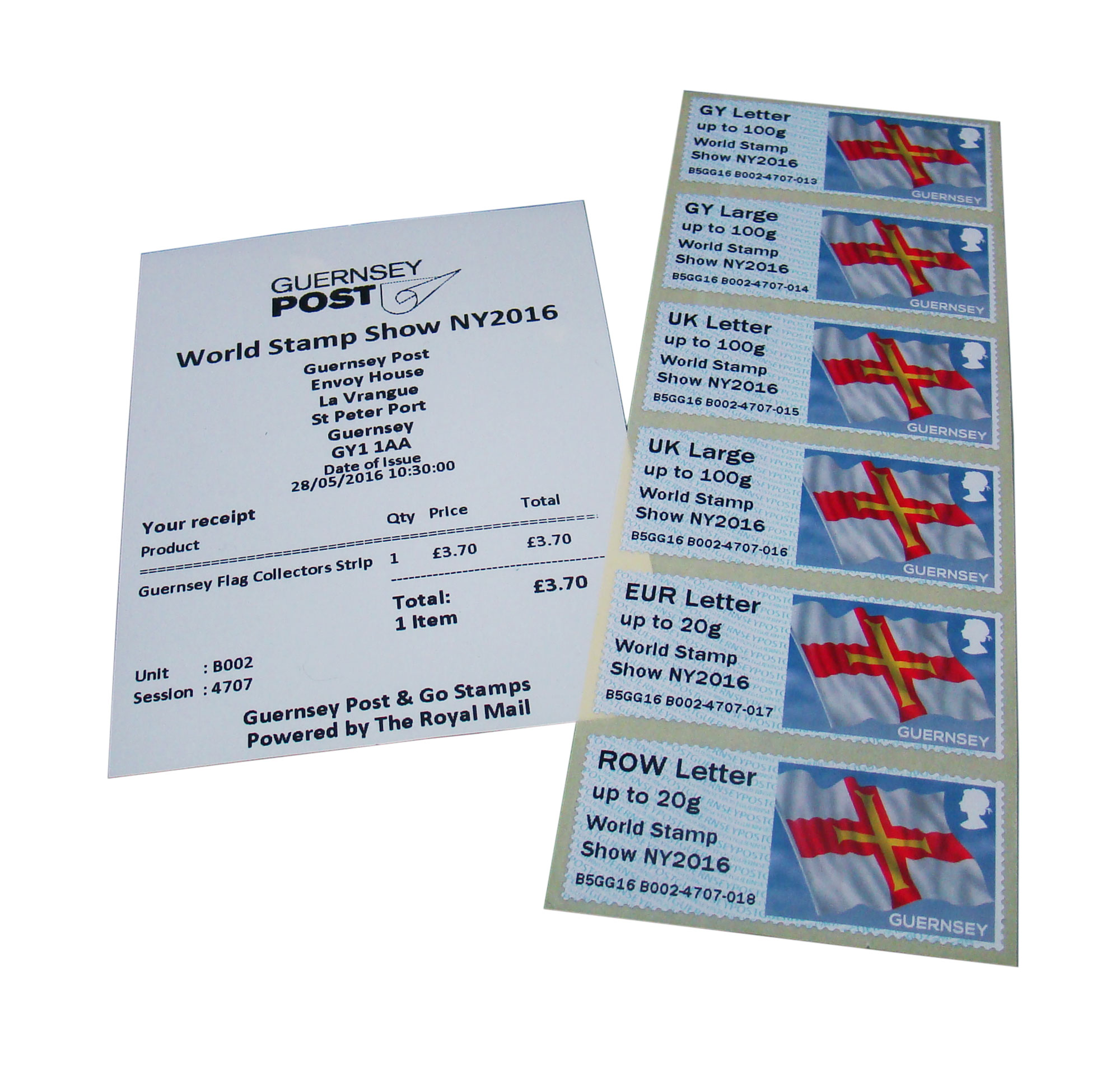 Guernsey Post is delighted to offer the B series of Guernsey Post and Go World Stamp Show New York 2016 Overprint featuring the Guernsey Flag. The Guernsey Post and Go stamps are available in six tariff weight steps: