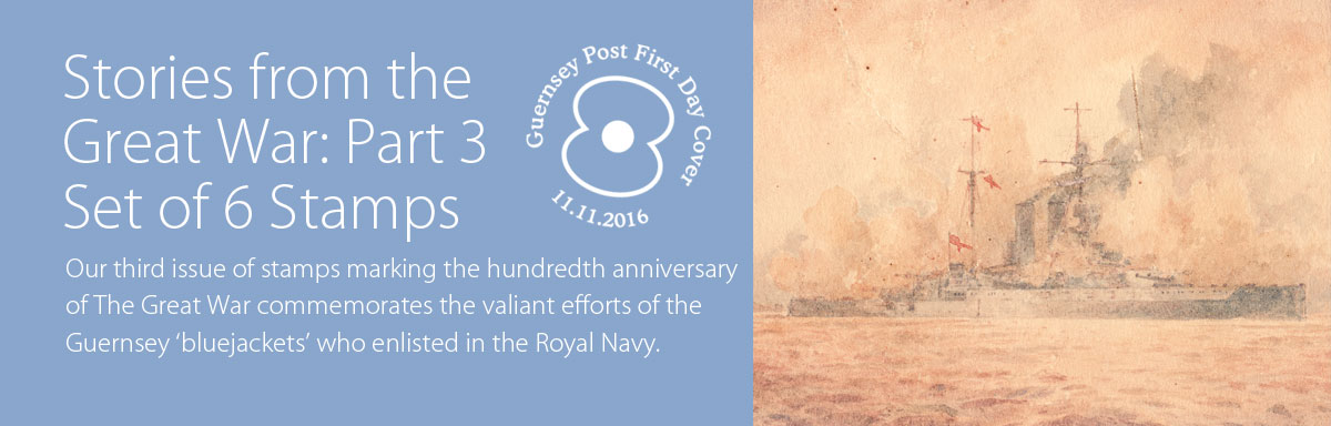 This third issue of stamps commemorating the First World War, explores the part played by the Guernsey men and boys who were engaged in the war at sea.