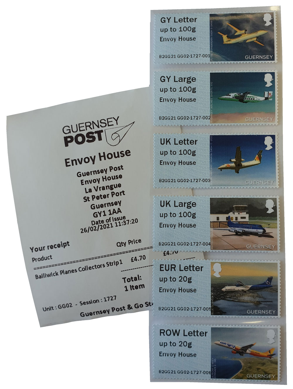 The Guernsey Post & Go ‘G Series (GG02)’ stamps carry unique identification numbers and no overprint and are available in six tariff weight steps.