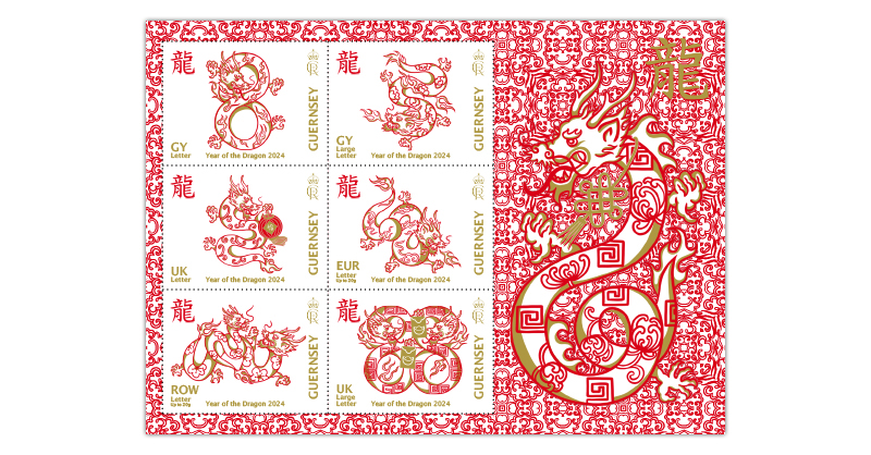 A small sheet containing one of each stamp from the issue, set against an illustrated background.